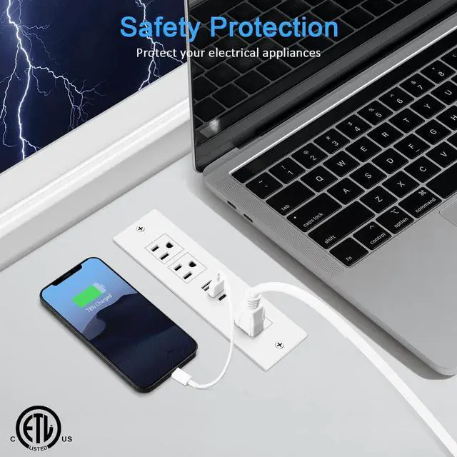Outlet Strip: High Quality recessed power strip with USB C was passed FCC & ETL certification. Fire-resistant outer shell and built-in safety system provides the USB C charger have 800J surge protection functional that can be over-current, over-voltage, and short-circuit protection effectively protect your devices from damage and ensure safer charging overnight.