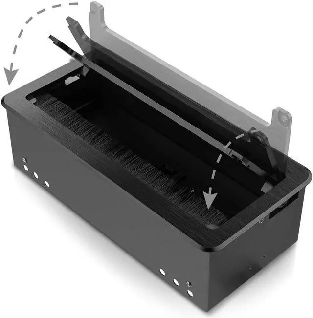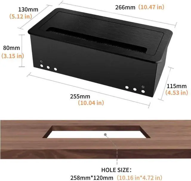 Easy to Install and UseCut a rectangle hole on table, place the outlet into the hole, then screw it tight. Panel size of multimedia power box: 10.47" x 5.12"(266 x 130 mm), suggested hole cut size: 10.16" x 4.73" (258 x 120 mm), R(edge treatment)=0.49"(12.5 mm). Open the lid then gain access to the hubs and connections easily with its 45 degree panel. Close the lid with the cables still plugged in through brush and opening in the lid.