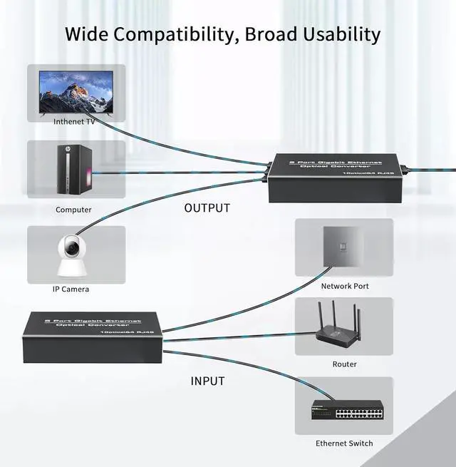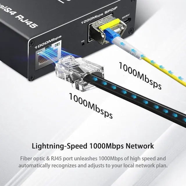 RJ45 Port and SPDIF port support max up to 1000Mbps, RJ45 compatible with most network ethernet cables, such as Cat8 Cat7 Cat6 Cat5. And compatible with network switches, routers TVs, set-top boxes, PCs, computers and more. The industrial SFP LC transceiver is 1.25G dual fiber, single -mode, transmission distance up to 20KM. You can also use other different brands of 1.25G SFP transceivers.