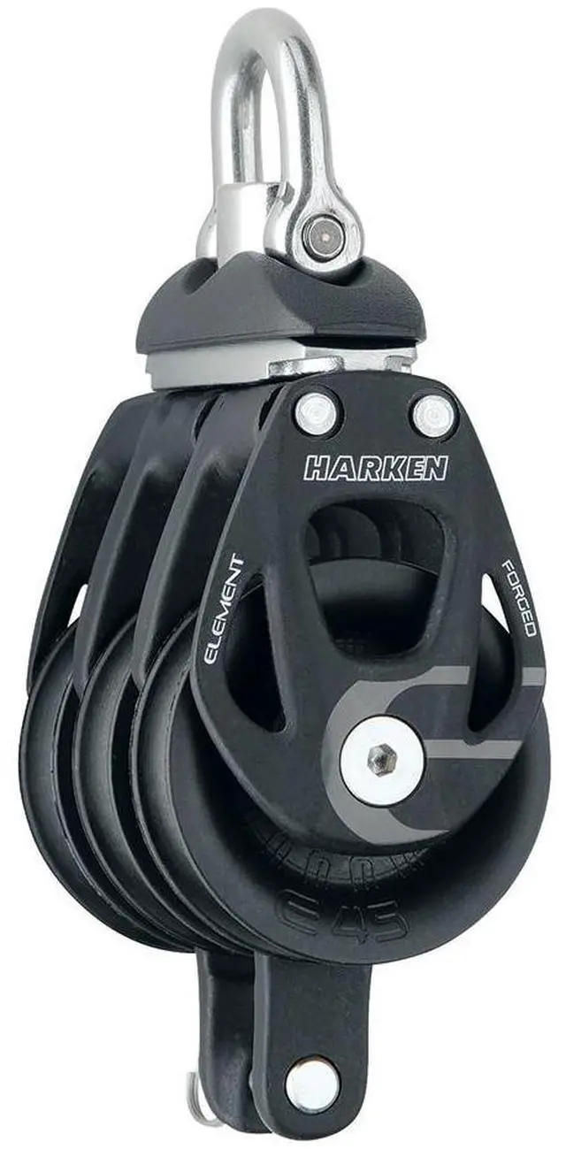 45mm Triple Element Block with Swivel & BecketElement blocks introduce sideplates that combine forged aluminum and compound curves for strength. They are simultaneously contemporary and very robust. Element’ s design pairs the minimum amount of metal required to protect the sheave with a proven journal bearing. So size for size, Element is priced significantly lower, than our previously least expensive blocks. brbrSideplates are hardcoat-anodized to resist corrosion. A tough composite bearing sheave resists corrosion for a long service life.