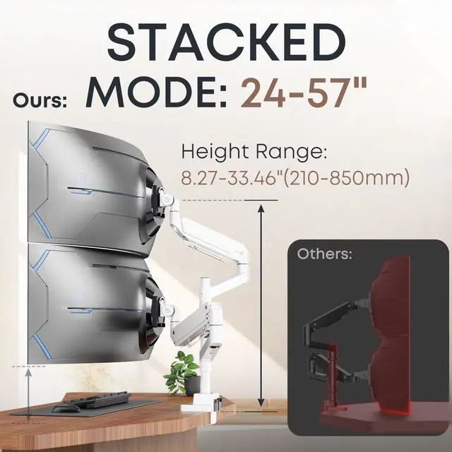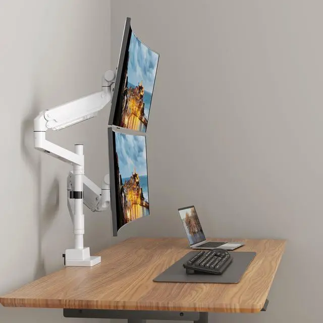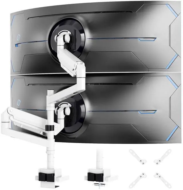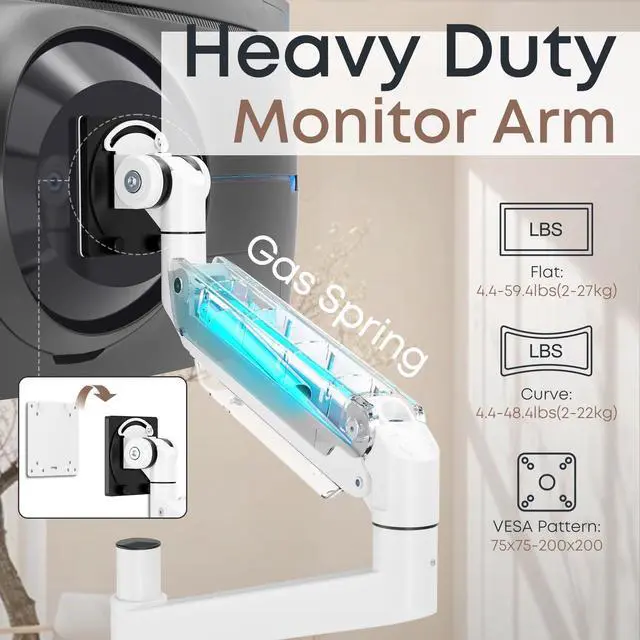 Support Stably: Ultrawide monitor arm made with high-quality aluminum, featuring enhanced tilting structure and gas springs, effortlessly hold flat screen up to 59.4 lbs & curved up to 48.4 lbs each arm, VESA patterns include 75x75, 100x100, 200x100, 200x200mm