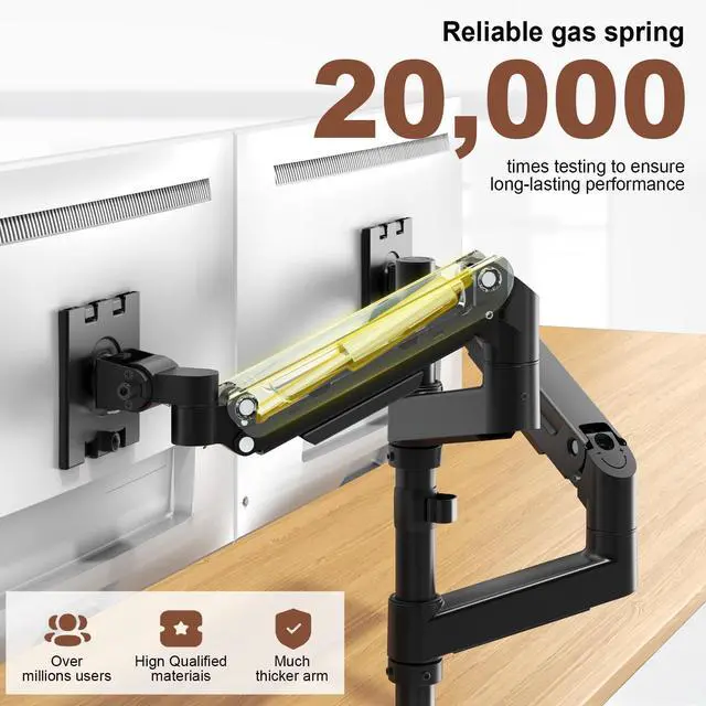 Heavy-Duty Gas Spring Arms Smooth, Stable, and Adjustable: Crafted from premium-grade aluminum and steel for unmatched durability. Gas spring arms offer seamless height adjustments and can be fine-tuned for monitor weight using the included Allen wrench