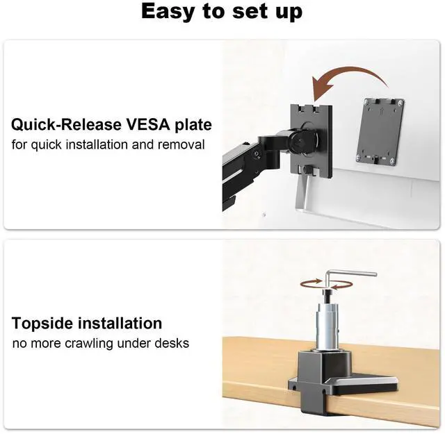 Tool-Free Assembly No Drilling Required: Quick-install VESA plates and a top-mount design make setup fast and hassle-free. Includes both C-clamp and grommet base options for desks up to 1.77 thick. Easy-to-follow manual and installation video included. Our support team is ready if you need help