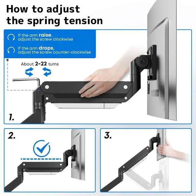Full Motion, Single Arm Freedom: This single monitor mount delivers smooth 180° swivel, +60°/-20° tilt, and 180° screen rotation. Its gas spring arm extends 22.83" horizontally and adjust highest 25.79" off your desk. Position your screen perfectly anywhere, eliminating neck and shoulder strain so you work comfortably