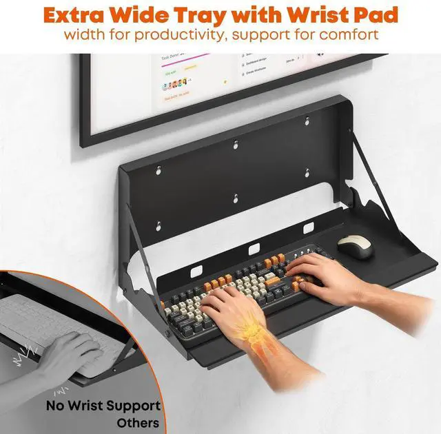 Extra-Wide 12-Inch Tray with Wrist Rest: The extra-wide 12-inch vented tray is designed to fit standard keyboards and mice, while the wrist support design ensures comfortable and ergonomic typing