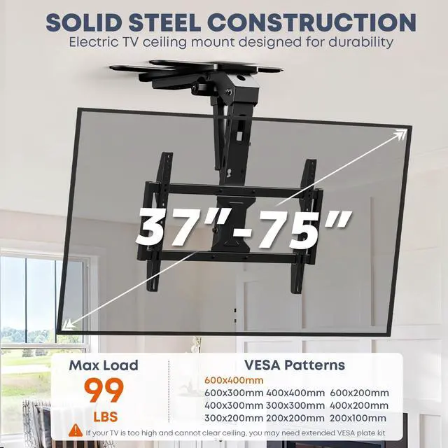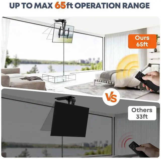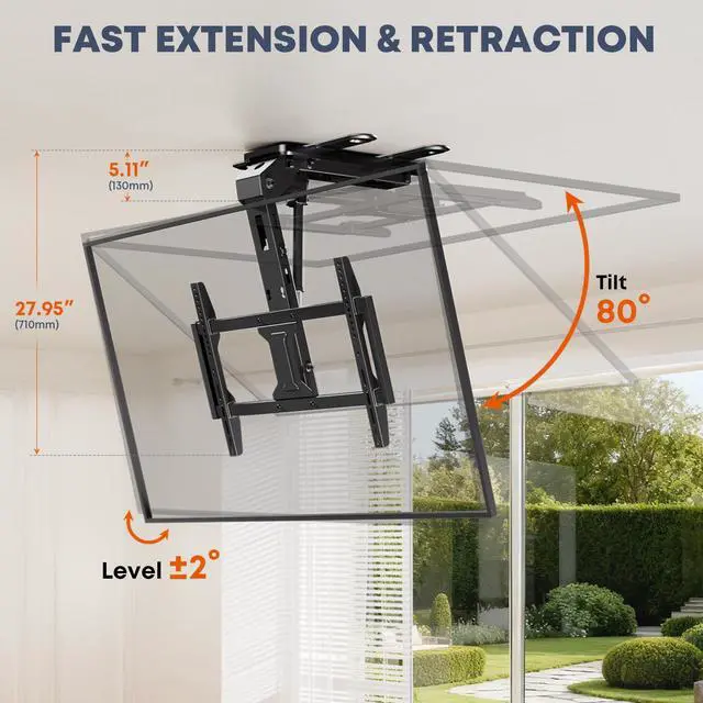 Smooth Motorized Drop Stop at Any Viewing Angle: Lower your TV from the ceiling with the included wireless remote. It takes up to 25 seconds to fully extend to the maximum 80° angle, but you can stop at any height to match your perfect viewing angle. The quiet motor ensures distraction-free movies, gaming, or video calls