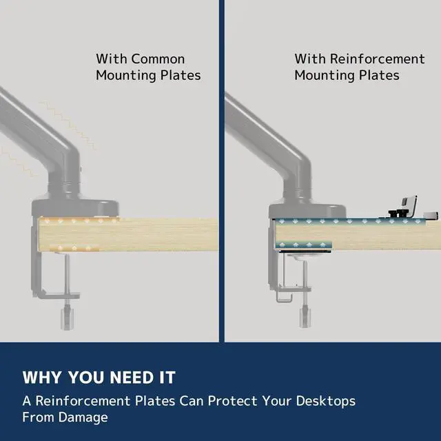 Quick, Tool-Free Installation: Installs in minutes simply place the reinforcement plate between your desk and monitor arm mount. Lightweight yet durable steel + ABS construction ensures lasting stability without damaging furniture