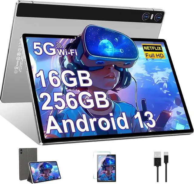 16GB RAM + 256GB ROM + 1TB ExpandableTablet Android 13 offers 16GB RAM(8GB RAM + 8GB RAM expansion) and 256GB Rom, and supports all brands of micro-rosd/TF cards from 4GB to 1TB. The 16GB RAM, you can launch apps quickly, and 256GB memory, you can enjoy millions of movies and TV shows, which brings you more convenient and smooth user experience, and makes the operation of apps and data storage more smooth. 10000 mAh & 5G WiFi & Bluetooth 5.0 & 4 Speakers & 8MP+20MPTablet supports 5G Wi-Fi for faster and more stable network connections.