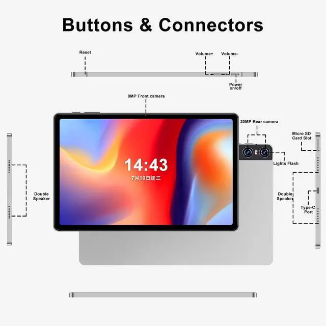 It connects Bluetooth headsets, Bluetooth keyboards and other Bluetooth devices via Bluetooth 5.0. The Tablet incorporates a long-lasting 10000 mAh battery and 4 stereo speakers for an immersive audio-visual experience. Tablet comes with an 8-megapixel front camera and 20-megapixel rear camera for sharper photos. 10000 mAh & 5G WiFi & Bluetooth 5.0 & 4 Speakers & 8MP+20MPTablet supports 5G Wi-Fi for faster and more stable network connections. It connects Bluetooth headsets, Bluetooth keyboards and other Bluetooth devices via Bluetooth 5.0. The Tablet incorporates a long-lasting 10000 mAh battery and 4 stereo speakers for an immersive audio-visual experience.
