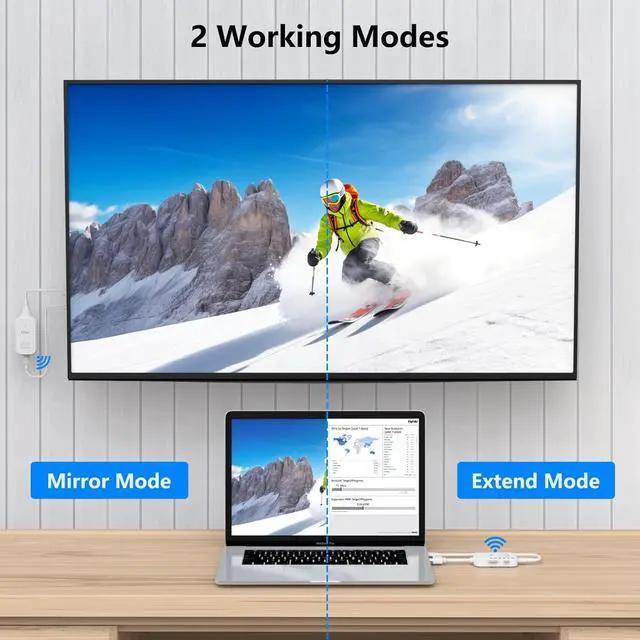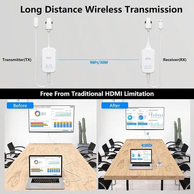 [ 98Ft/30M Wireless Transmission] HDMI wireless video transmitter and receiver allows to wirelessly transmit or extend audio/video signals to high-definition TVs, projectors or monitors with only low 0.1S latency, the wireless range up to 98Ft/30M in an open filed without any obstacle. Transmission distance is enough to cover the entire conference room or room in home.: The transmission distance will be shortened when working through the wall or floor. [ Wide Compatibility ] The wireless HDMI sender and receiver are light weight and easy to carry anywhere. The wireless HDMI extender kit is compatible with most HDMI output devices, including laptops, PCs, Blu-ray players, cameras, DVDs, DSLR cameras, set-top boxes, and more. ( ) [ Important Note] When the product becomes freezes or stuck or disconnect; When the computer is low power or the current to the HDMI input on computer is low, the power light on the transmitter will be weak or extinguished; In these 2 cases, please plug 5V/1A adapter (Not Included) into a wall socket to supply external power for the HDMI wireless kit.: This wireless HDMI extender doesn't support using with HDMI splittter. [ Warm Tips] 1If the connection fails, you could try re-pairing the kits manually by following the steps in video; 2Since wireless video transmitter and receiver will have a little bit delay, we dont recommend you connect this wireless HDMI extender to gaming console. 3If there is no audio transmission, please check if you mute your PC or your monitor doesn't support audio playback. 4 If there is no video or image on big screen, please press" Windows+P" to choose copy or extend mode.