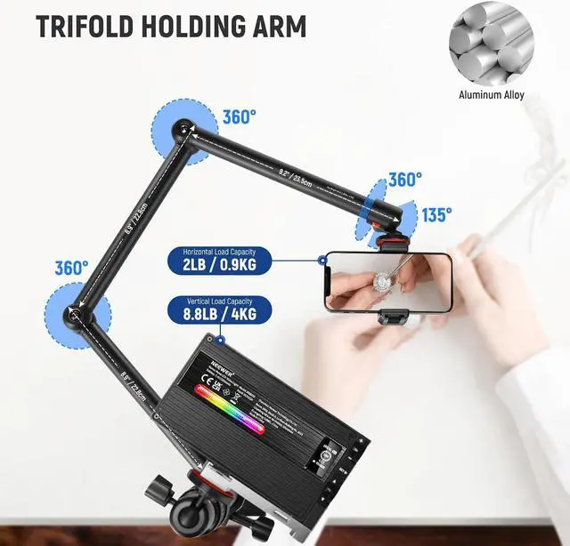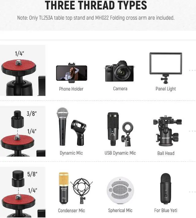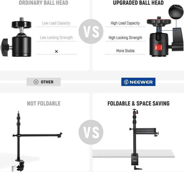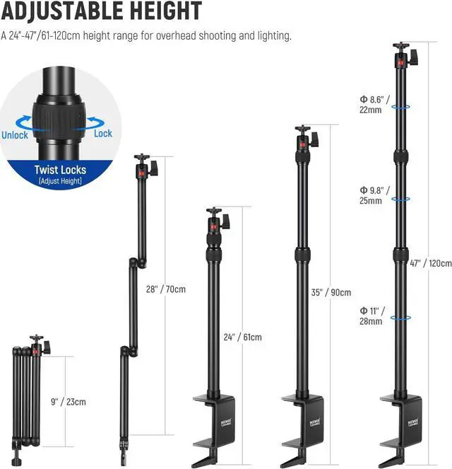 3 Section Tabletop Stand with C Clamp The stand can firmly fit over a desk up to 3.5" /9cm thick with the C clamp. 3 telescopic sections offer a 24"-47"/61-120cm height adjustment that lets you position the device overhead or at eye level. Reinforced with larger tube diameters ( 1.1" /28mm, 1"/25mm, 0.9" /22mm), the stand can stabilize equipment up to 8.8 lb/4kg in weight360° Rotatable Ball Heads Ball head adapters can mount DSLR cameras, mirrorless cameras, phone holders, webcams, LED video lights, and other devices with a 1/4" thread.