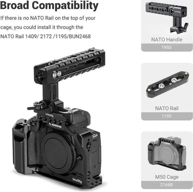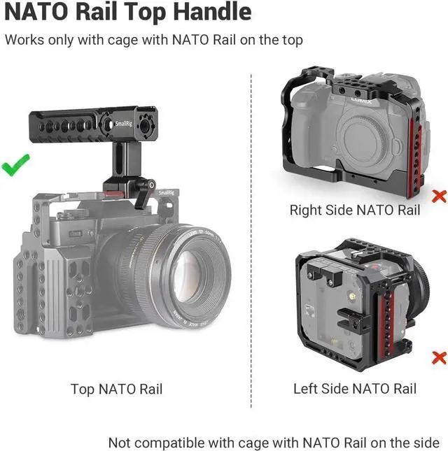 [QUICK RELEASE] The DSLR NATO Handle can quickly mounts to a standard NATO rail without any tools. It has been upgraded to resolve an issue where the NATO clamp was not compatible with some NATO rails. It can work with SmallRig NATO rail 1409 (Not included) and quick attaching and detaching via the thumbscrew.