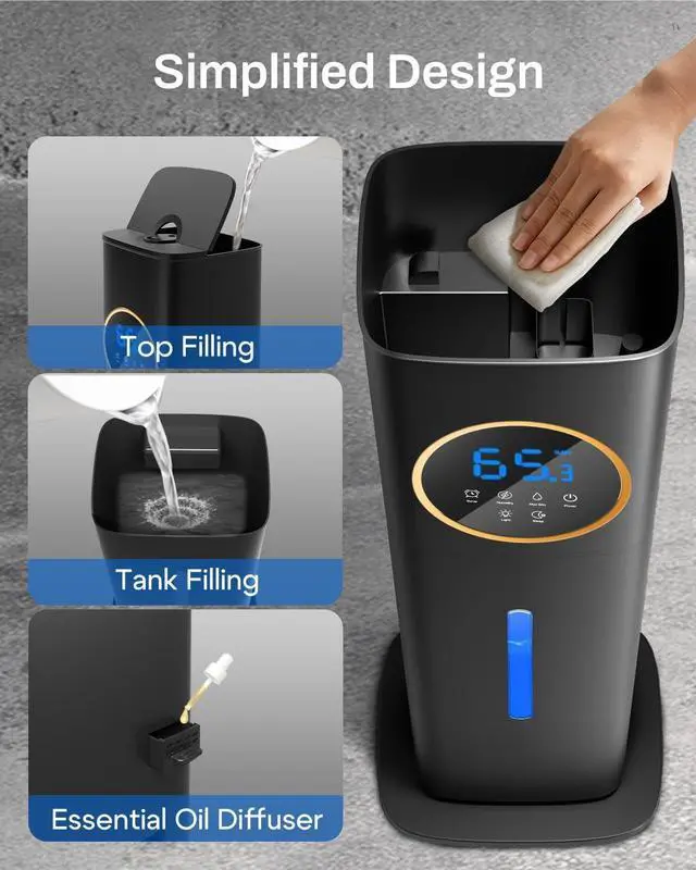 [ & ° ] Simply add 1-2 drops of your favorite essential oils to the tray located at the back, and enjoy the delightful fragrance. The 360° rotating nozzle enables you to adjust the mist flow direction as per your needs. The humidifier also includes automatic shutdown when it reaches the custom humidity level or when there is no water, ensuring safety and preventing damage. It is also designed with a detachable water pump and suction pipe for low-cost maintenance.