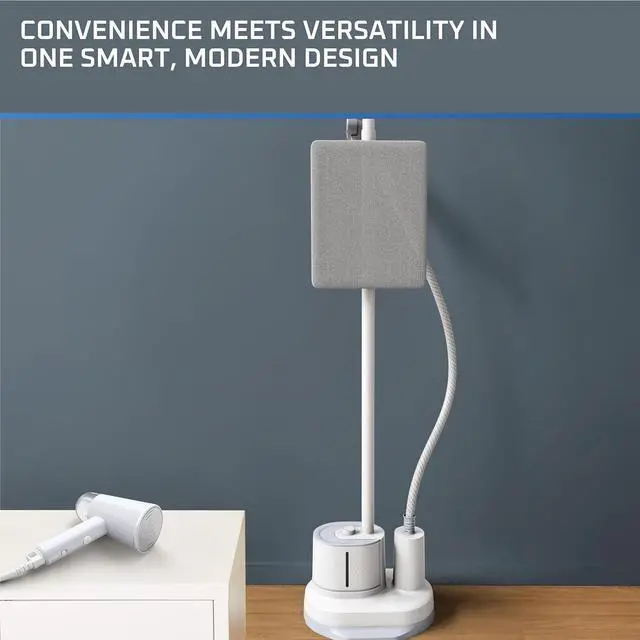 : The vertical board with this clothes steamer standing highlights versatility, enabling steam for clothes or delicate fabrics in an upright position