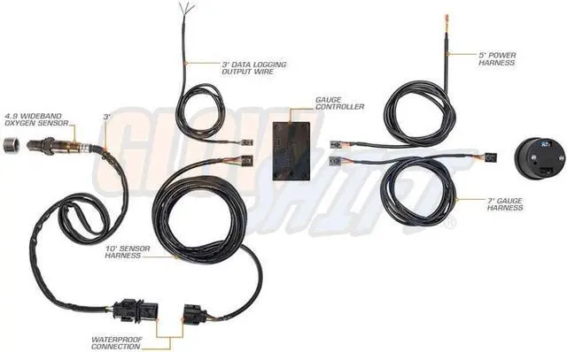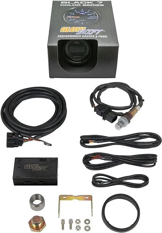Includes 4.9 LSU Wideband Oxygen Sensor, Weld-In Bung, Control Box, 10' Sensor Harness, 7' Gauge to Control Box Harness, 5' Power Harness, 3' Data Logging Wire, Gauge Visor, Mounting Hardware & Installation Instructions