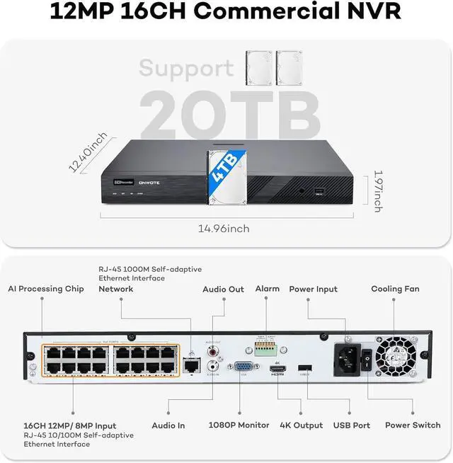 NVR PoE Security Camera System 4K, 16 Channel 12MP Commercial NVR 4TB, 8X 8MP Wired Outdoor IP Cameras, 134° FoV, AI Detection, 24/7 Video Audio Recording, CCTV Surveillance for Home Business