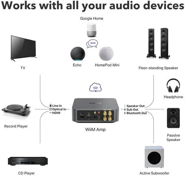 Home Theater Magic, Simplified - Elevate your entertainment experience effortlessly with the WiiM Amp's HDMI ARC port. Plug in your TV and immerse yourself in rich stereo sound for shows, movies, and video games. Craving that extra oomph Simply add a powered subwoofer to take your audio to cinematic levels. With minimal setup required, the WiiM Amp offers a seamlessly integrated AV system that turns your living room into a home theater paradise.