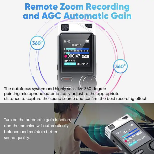 The most diverse functionsOne click recording on startup, easy to operate. The optimized menu selection provides a more intuitive navigator, and the recorder has all the functions you want, including A-B repeat, fast forward, rewind, 3.5 mm headphone jack, MP3 player, bookmark function, voice control function, variable speed playback, password and line input, etc. The powerful voice control function automatically records when the sound reaches the correct sound decibel level, and stops recording when there is no sound. It greatly saves memory space and listening time, and is widely used in classrooms, meetings, and language learning.