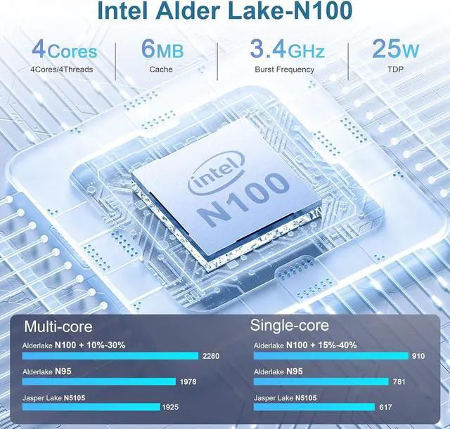 High-Speed NetworkThe mini desktop pc supports Wi-Fi 6 ( 802.11 ax) for ultra-fast wireless connections, enabling smooth streaming and speedy downloads. Compared with Wi-Fi 5, Wi-Fi 6 is nearly 3 times faster, you can have a dedicated and undisturbed channel when playing games. Built-in Bluetooth 5.2 allows for effortless pairing with various peripherals, such as wireless keyboards, mice, earphones, monitoring camera, printer, monitor, TV, projector etc