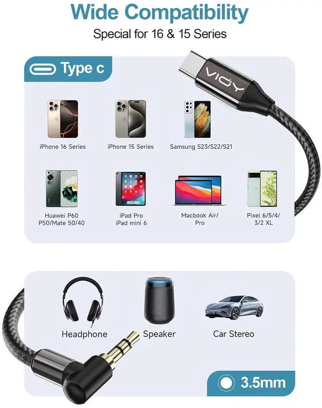VIOY Type C to 3.5 mm Aux Cord for Car for iphone 16/15 Series