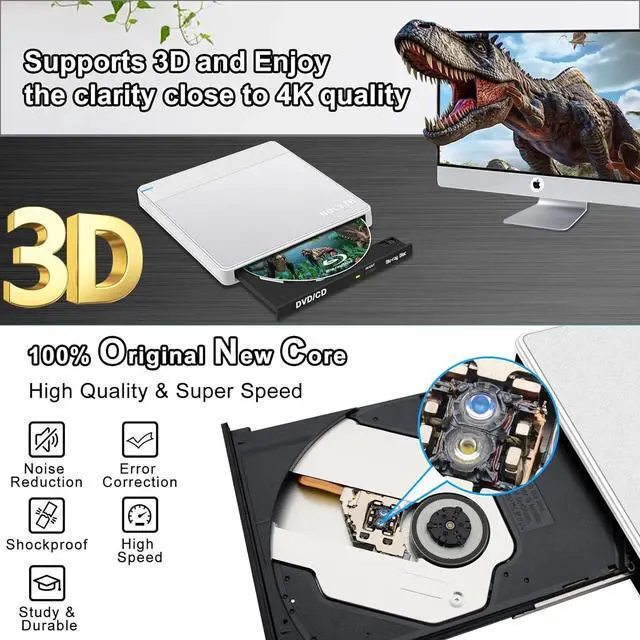 Supports 3D Bluray Burner: This bluray burner external supports the playback of 3D movies and enjoy the clarity close to 4K quality. Make sure the playback software on your computer supports the Blu-ray format. Download the free software "Cyberlink BD&3D Advisor, start the test, it will tell you the result if your computer supports Blu-ray or 3D playback. Please note that this USB blu ray drive external doesn't come with Blu-ray playback/burning software and can't play 4K Ultra HD discs, but supports M-Disc