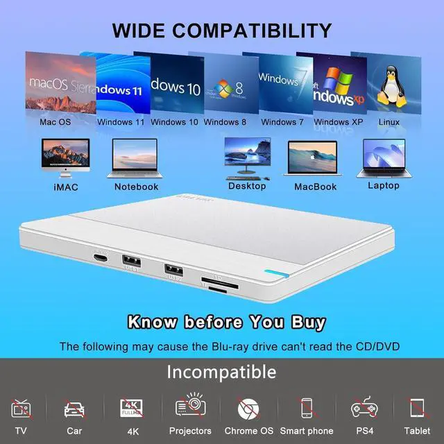 Versatile Compatibility Bluray Drive External: Whether you have a Mac or Windows computer, this external blueray/dvd drive for pc is compatible with all versions of MacOS, Windows and Linux. Note that this blu ray player for pc must be connected to a laptop/desktop to read CD/DVD/BDs, and this external blu ray player can't support iPad/Tablet/Projector/TV/Car/Chrome OS/Car/Phone