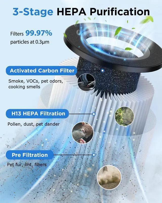 Silent Sleep Mode & Timer: Sleep mode provides a quiet fan for peaceful nights, Operating at just 15db, you'll hardly notice it's there. The Timer(2H/4H/6/8H) function lets you preset operation times, you can set the bedroom air purifier to run for a specific duration, saving energy and maintaining indoor air quality even when you're away.