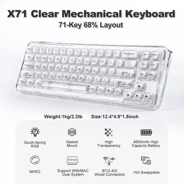 Hot Swappable PCB with TTC SocketYUNZII X71 keyboard is equipped with hot-swappable PCB to ensure easy replacement of different mechanical switches with 3-pin and 5-pin. The X71 Hot-Swappable Custom Keyboard adopts pre-lubed transparent mechanical switches with 50 million keystroke lifespan. The TTC socket With N-key rollover, it can respond to the simultaneous press of multiple keys, better for using hotkeys or gaming.