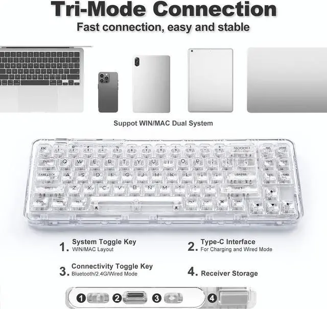 Simple button to switch WIN/MAC layoutsPress the key button to instantly change the keyboard working system to Mac / Win. The 71-key 68% layout keyboard saves more space for desk setup. This RGB gaming keyboard is based on ergonomics with large surface keycaps design brings maximum comfort, suitable for gamers, office workers, copywriters, editors and so on.