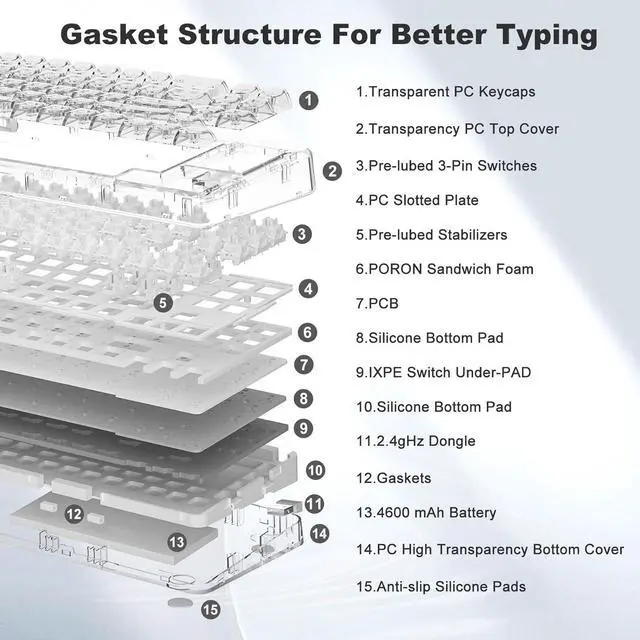 Gasket Mount Mechanical KeyboardThe YUNZII Custom Keyboard utilizes a high-quality gasket material and silicone pad to absorb vibrations and eliminate any noise. Equipped with poron sandwich foam, poron socket foam, PET sound pads, X71 gasket mounted mechanical keyboard, provides you with a quieter and smoother typing experience for a unique typing feel.