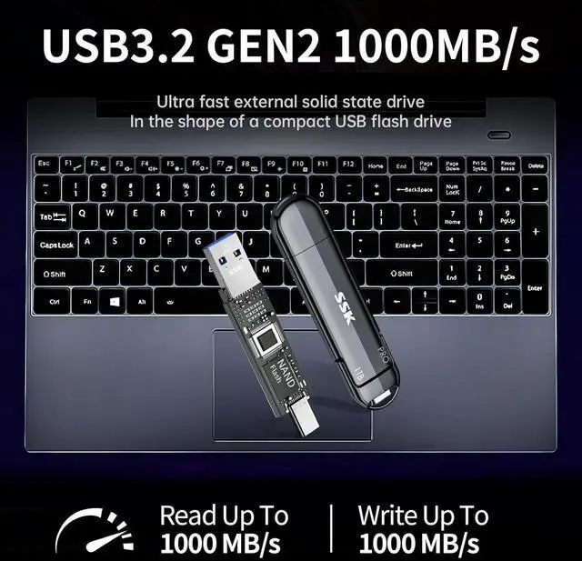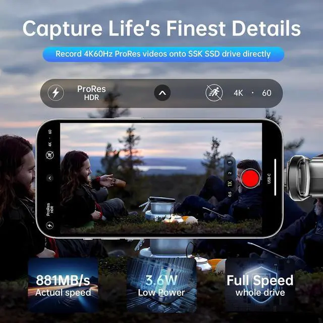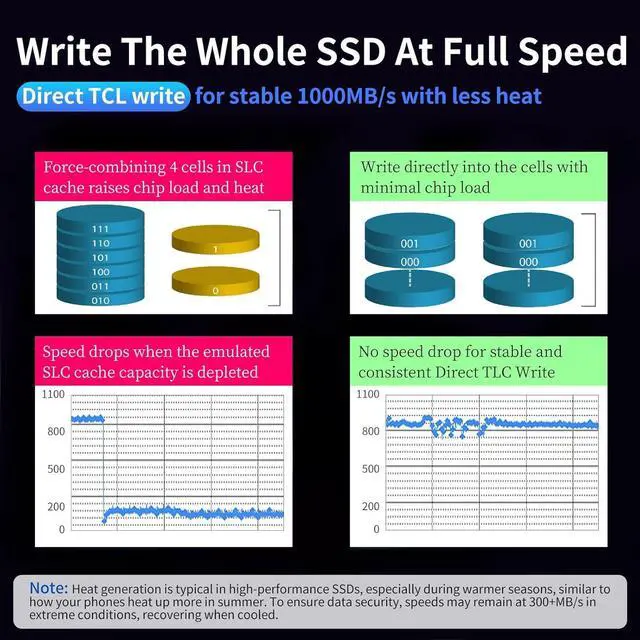Less Heat: Zinc alloy case of this portable SSD brings superior heat dissipation and premium touch. Additionally, Direct-to-TLC Write technology significantly reduces chip workload, minimizing heat generation from the USB SSD. Under normal conditions, temperatures peak at 132.8 °F