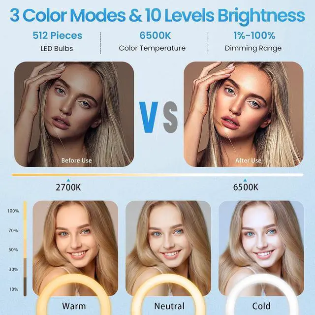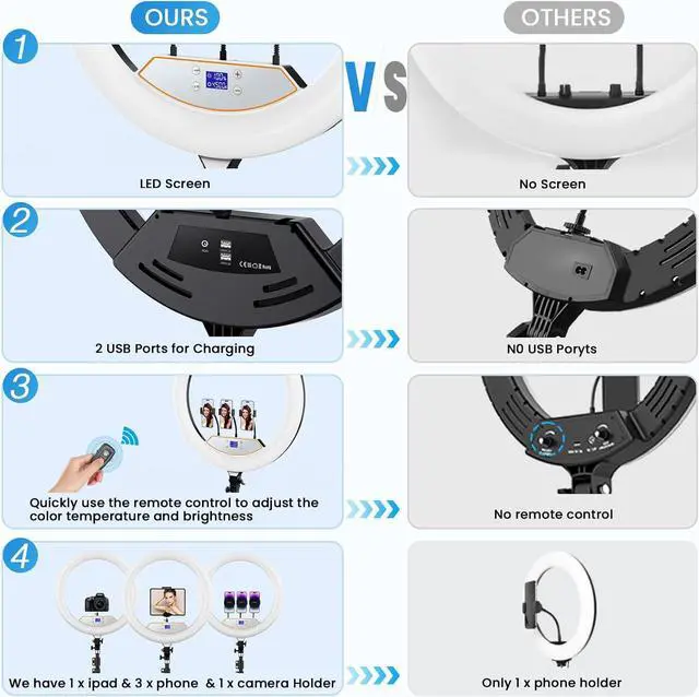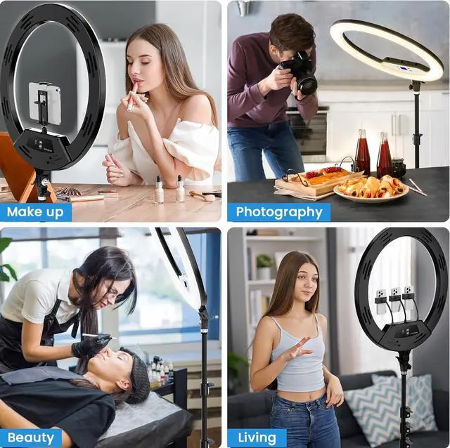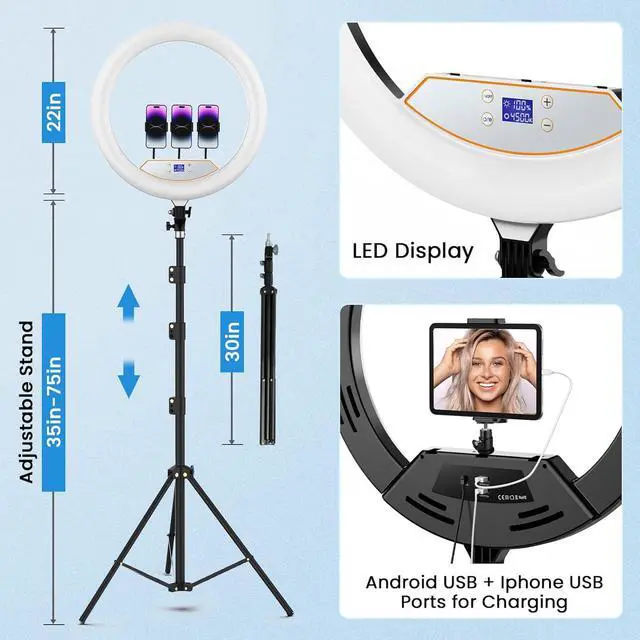 Selfie: MACTREM ring light equipment comes with remote controller and bluetooth remote control CH-3 with a maximum range of 5 meters[ 16.4 feet]. This will ensure you to have the best pictures and videos with the most suitable distance and brightness. The big ring light also comes with 2 USB charging ports, customized for your long live broadcasts. For the stability of 22 inch ring light, we equipped a tripod with maximum load bearing of 18lbs[8 kg]. The tablet ring light adjustable height ranges from 27 inches[69 cm] to 75 inches[190 cm]. The aro de luz profesional is most suitable for iphone, tablet, camera