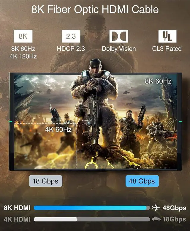 • 8K FIBER OPTIC HDMI FOR GAMERS: Its latest game mode supports Variable Refresh Rate (VRR) - when the scene is switched, the refresh rate will change accordingly to obtain a smoother, lag-free and more detailed picture. Supports HDCP 2.3 & 2.2, QMS, QFT, ALLM, DTS Master, DTS:X, Dolby Atmos, Dolby Vision