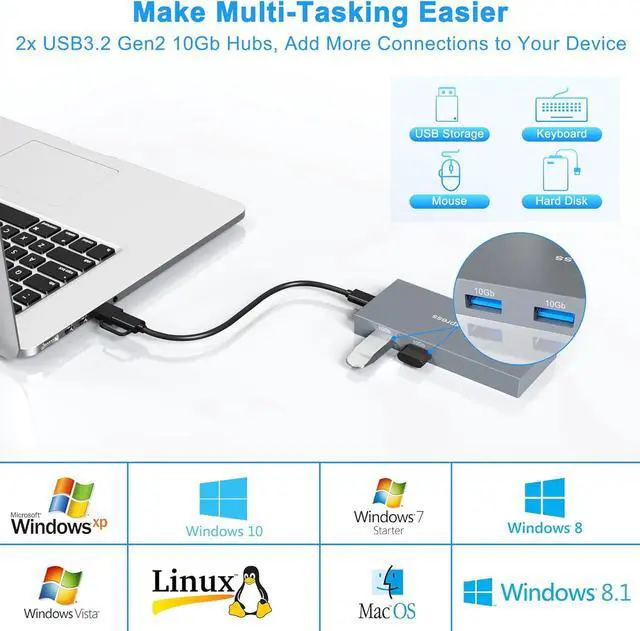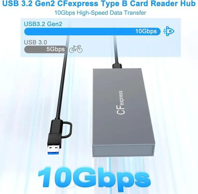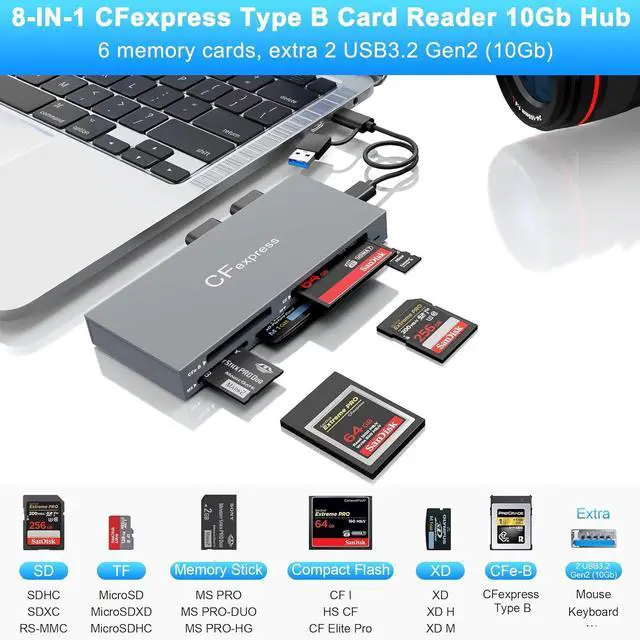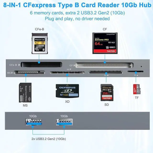 Wide Compatibility: CFexpress Type B card reader 10Gb Hub is highly compatible with CFexpress Type B cards (up to 2TB), SD (SD, SDXC, SDHC, RS-MMC), TF (microSD, microSDXC, microSDHC), CF (CF I, HS CF, CF Elite Pro), MS (MS Pro, MS Pro- Duo, MS Pro-HG), and XD (full series of XD-Picture Cards, includs Olympus and Fujifilm XD Picture Card 1GB 2GB) cards. The Extra 2* USB 10Gbps ports can work with your external hard drives, mouse, keyboard and other USB devices, etc.
