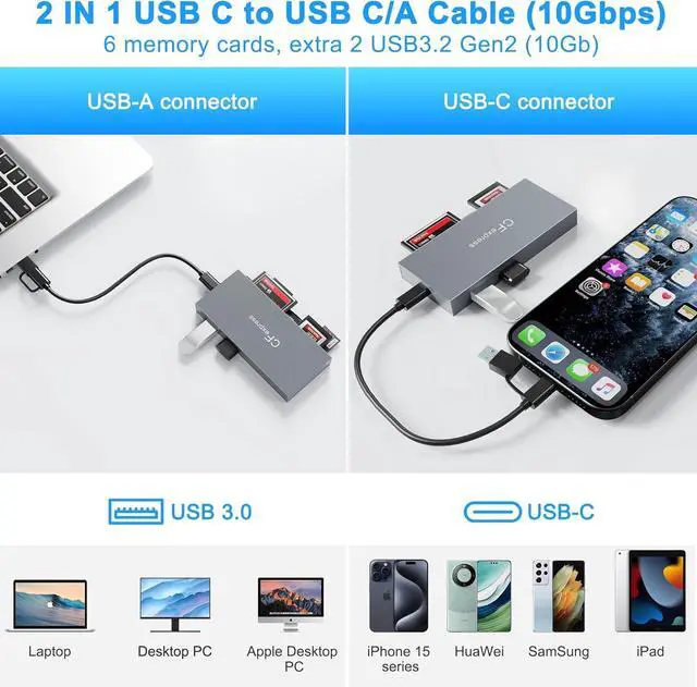 USB A/C to USB C 2-in-1 Cable: This CFexpress card adapter comes with 2-in-1 USB Cable (USB-A TO C Cable or USB-C TO C Cable), the 2-in-1 cable designed to be compatible with all USB type C and USB A device.