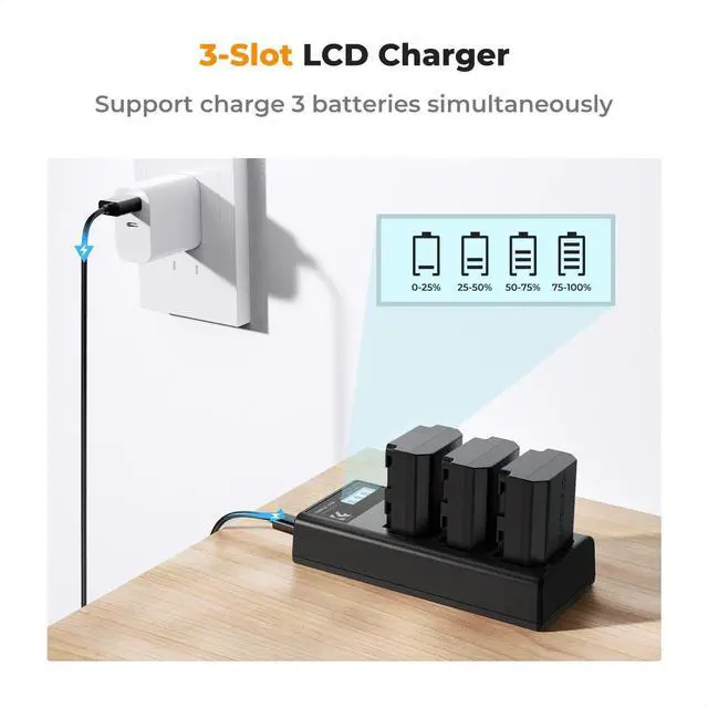 Dual Input Fast Charging. The a7iii battery charger has Micro USB and Type-C port input (5V/ 2.1A ), which can be charged by connecting to a 5V wall charger, car adapter, mobile power supply and so on. Via the 5V 2.4A Type-C charging port, you can fully charge 3 batteries in 6 hours.