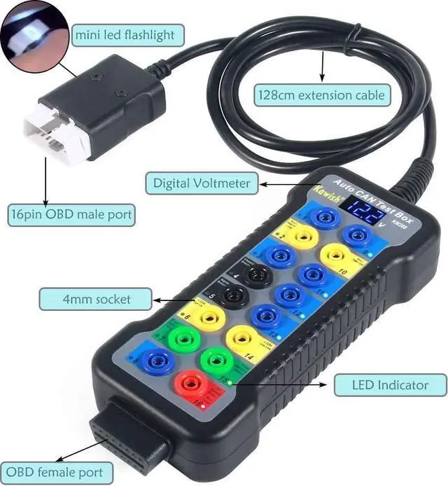 4mm banana plug & 128cm extension cord The OTC Can test box has a safety banana socket that accepts all types of 4mm banana plugs. You can connect a multimeter or oscilloscope to the banana socket to detect the detailed signal information of the corresponding lit port. The cable length of the obd ii breakout testing box is 128cm, which makes device connection more convenient and you don't have to operate in a narrow space in the car.