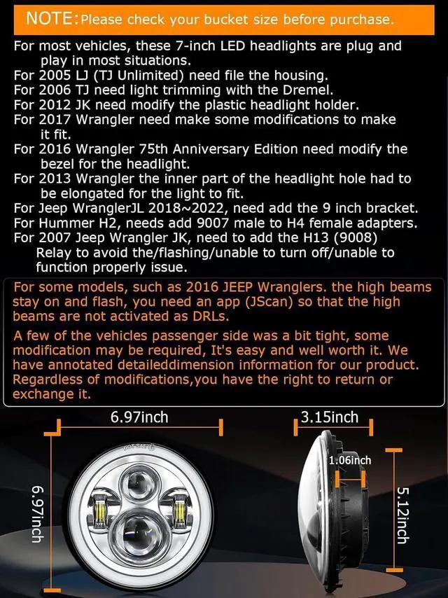 Wide Application7'' led headlight compatible with jeep Wrangler JK 2/4 Door 2007-2018; Compatible with jeep Wrangler TJ 1997-2006; Compatible with jeep Wrangler CJ-7 1976-1986; Compatible with jeep Wrangler TJ Unlimited/LJ 2003-2006; Compatible with CJ-8 Scrambler 1981-1985; Compatible with Mazda Miata; Compatible with Chevy. Pls check the size of your vehicle bucket