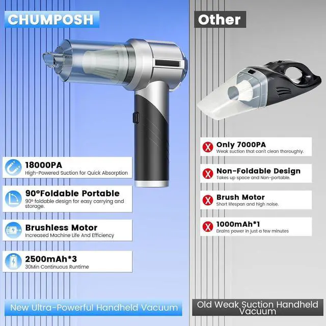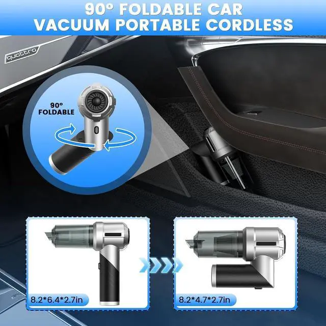 90°Foldable and Compact Handheld VacuumThe CHUMPOSH car vacuum - portable air blower/car vacuum is designed with portability in mind, featuring a 90° foldable design to save space and make storage effortless. Lightweight and compact, its perfect for on-the-go use, ensuring easy handling during your travels. Plus, it comes with a convenient storage bag for hassle-free carrying, so you can keep your vehicle clean wherever you go.