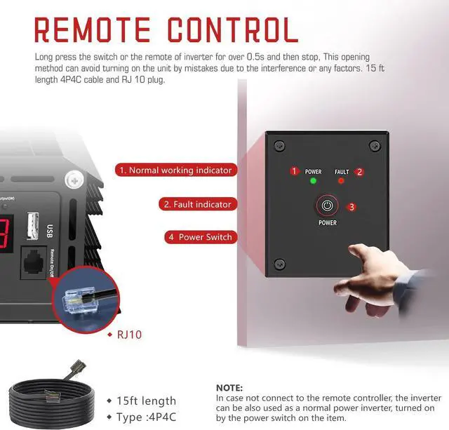 Inverter with Remote Control: cable length 15ft, the long cable will help you control the inverter ON/OFF easily.