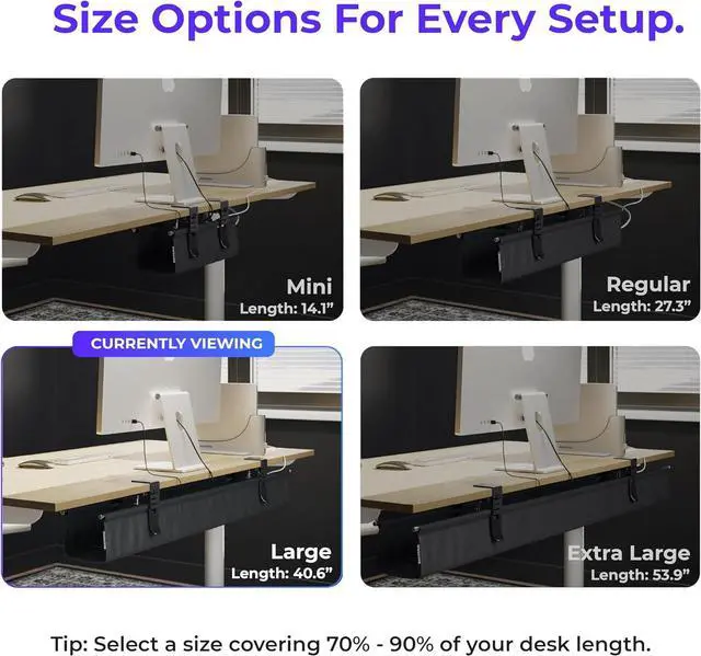 Ascrono's cable tray comes in 4 different sizes: the smallest (S) size being 14.1", while the largest (XL) is almost 54" long. In comparison to an iMac monitor that measures 24", this cable tray provides plenty of space