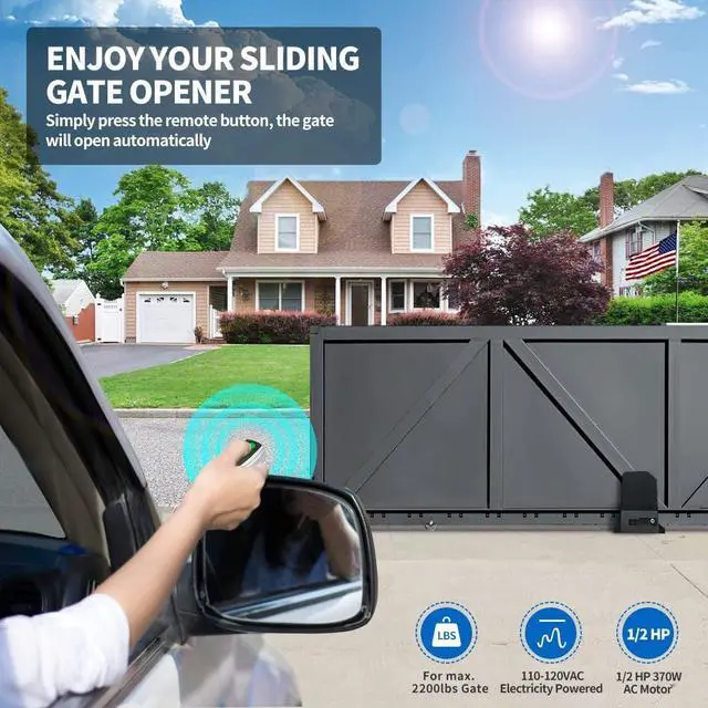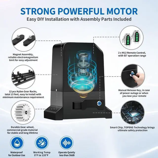• Strong Gate Opener - TOPENS RK990T automatic gate opener, equipped with a STRONG 1/2370W AC motor, effortlessly drives the heavy-duty slide gate up to max 2200lbs. in weight and max 40ft. in length. This ultra-quiet electric gate motor ensures convenient and comfortable gate operation, enhancing your family's lifestyle.