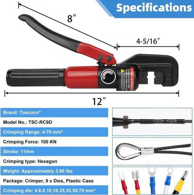 PackageComes with hydraulic crimper, 9 pairs of dies, a pair of gloves, 5 replacement seals, an instruction manual, and a carrying case. Every unit undergoes 100% double inspection before leaving the factory. If you encounter any quality issues, please contact us for prompt assistance.