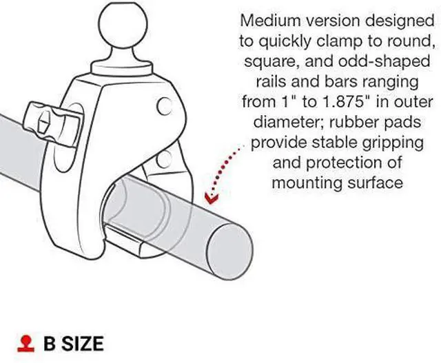 Medium version designed to quickly clamp to round, square, and odd-shaped rails and bars ranging from 1" to 1.875" in outer diameter; rubber pads provide stable gripping and protection of mounting surface