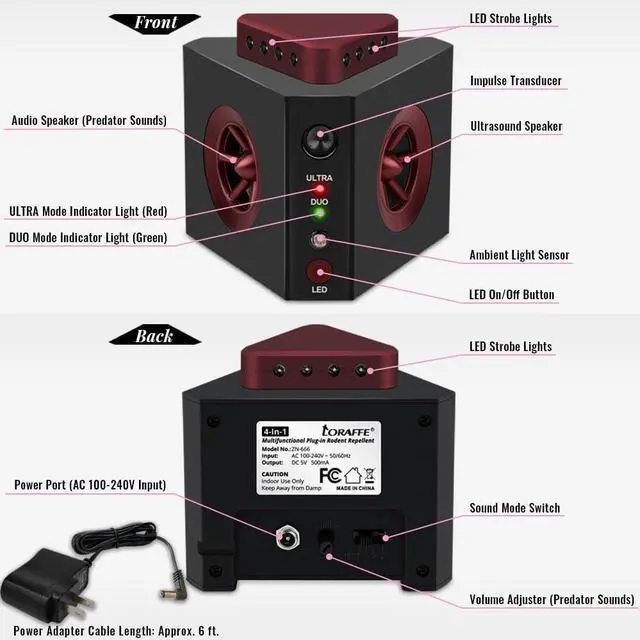 Volume Control: Choose from four sound modesTEST, ULTRA, DUO, and TRIObased on your environment. The volume controller allows you to adjust the sound of predator frequencies for the most effective rodent control and pest repellent performance.
