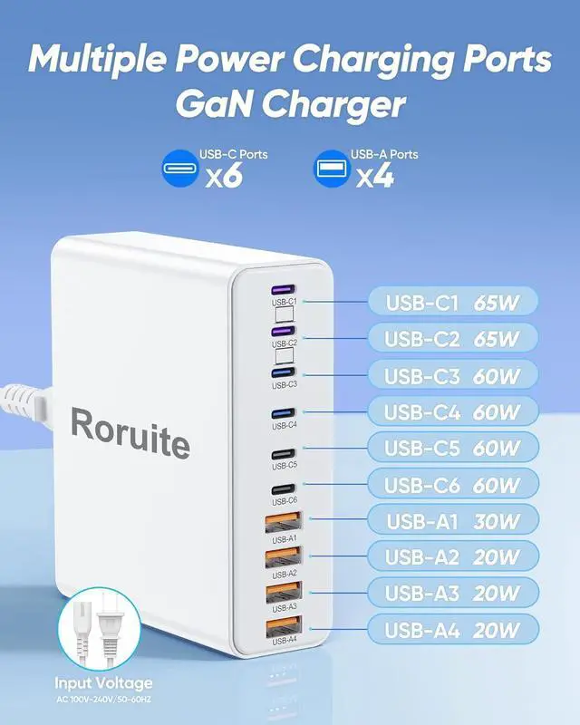 6 Layers of Safety Protection The Roruite charging station uses advanced GAN III chip technology with built-in protection mechanisms for your devices. It includes 6 layers of safety features such as overheating protection, overvoltage protection, overcurrent protection, overload protection, overcharge protection, and short-circuit protection. This ensures your devices are charged safely and efficiently, providing peace of mind while you power up your electronics.