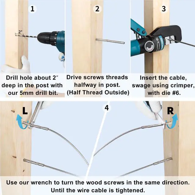 We have a cost-effective cable railing system: 1/8" lag screw DM60, 1/8" steel cable and cutter DW40, hydraulic Crimper DC01. Drill guide DG12 can help you with drilling.
