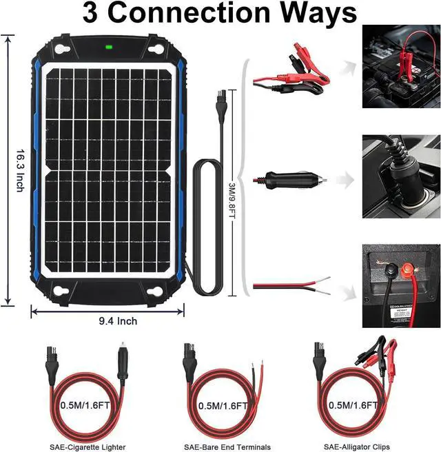The high efficient solar panel allows to absorb a wider spectrum of the sun light, as long as there is sufficient sunlight available, the charger will generate an electrical current to trickle charge battery. The charger is built in the most super ligent MPPT (Maximum Power Power Tracking) chip to ligently charge and fully protect battery. The MPPT technology helps to generates at least 20%-30% more power than traditional PWM. And the LED indicator helps better understand the charging statue in all days.