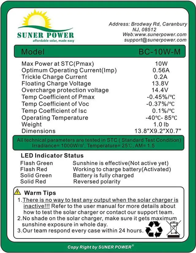As we all know, batteries naturally drain power and if allowed to go flat, may never regain their full power. This product is a solar powered battery maintainer and charger for 12V batteries and helps manage battery drain in all season. The solar charger converts light energy from the sun into 12 volt DC electricity which is then transported to the rechargeable batteries through lead wire and connector of choice, replace the self-discharge of a battery in storage, so that the battery wouldn't "go dead". It can be used for gate opener, electrical fencer, cars, 4WDs, trucks, motorcycle, marine, boats, farm equipment or any application where a 12v battery is used.