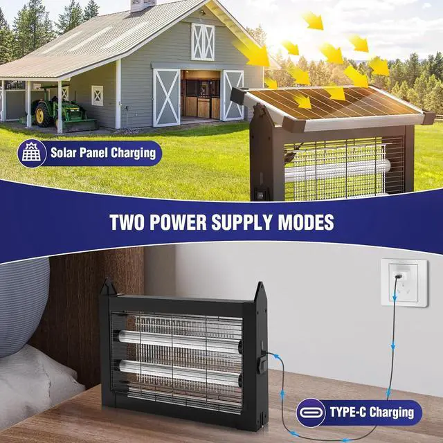 Diverse Power Supply Options: The solar bug zapper outdoor is designed with three effective power supply methods: a 10 W 5V solar panel, a Type-C cable, and a rechargeable battery. The fly zapper's battery charges in 4-6 hours, with an indicator changing from red to green when fully charged. A single charge can last about 12 hours. Outdoor bug zapper features an adjustable solar panel for optimal light exposure. When using outdoors, cover the charging and switch ports to waterproof the device.